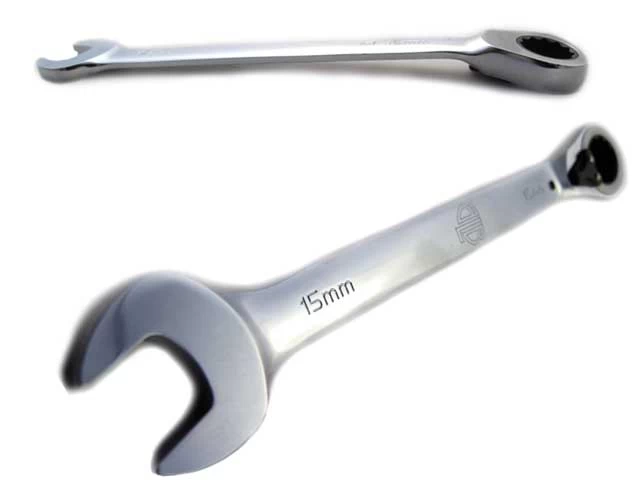 Ein 15 mm Maulschlüssel auf dereinen Seite und auf der anderen ein 2-seitiger 15 mm Ratschen-Ringschlüssel. Er ist lang genug um einen ordentlichen Hebel zu haben und trotzdem leicht in der Tasche verstaubar zu sein.
